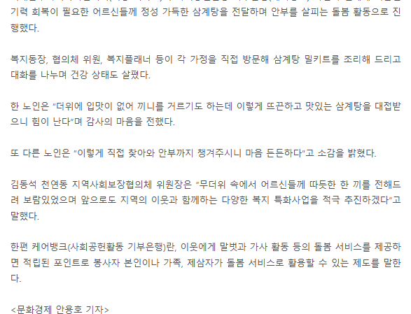 복지동장, 협의체 위원, 복지플래너 등이 각 가정을 직접 방문해 삼계탕 밀키트를 조리해 드리고 대화를 나누며 건강 상태도 살폈다.